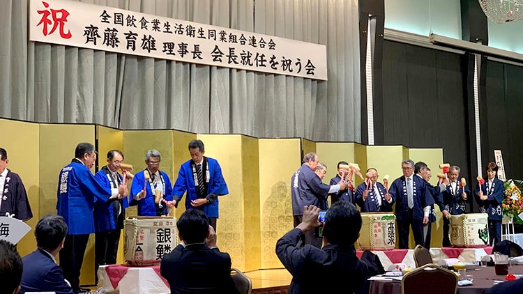 全国飲食業生活衛生同業組合連合会の会長に秋田県の齋藤育雄理事長が選出されて、今日はその就任のお祝いです。誠におめでとうございます♪ 鏡開きに秀よしも一役かいました。