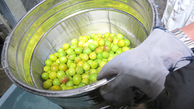 丁寧に洗った梅は、「純米酒」に漬けていきます。