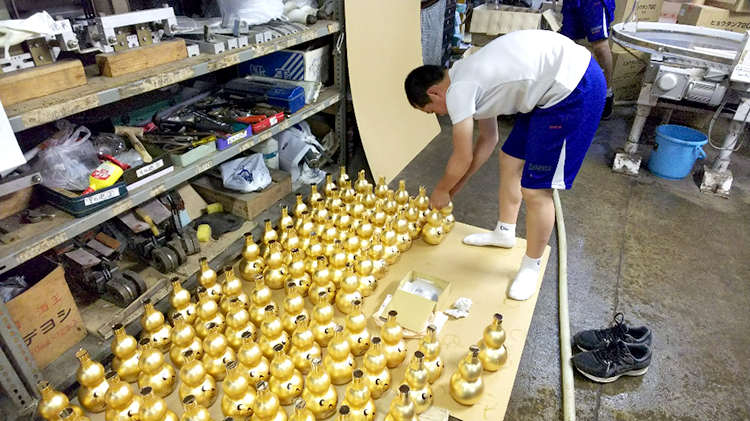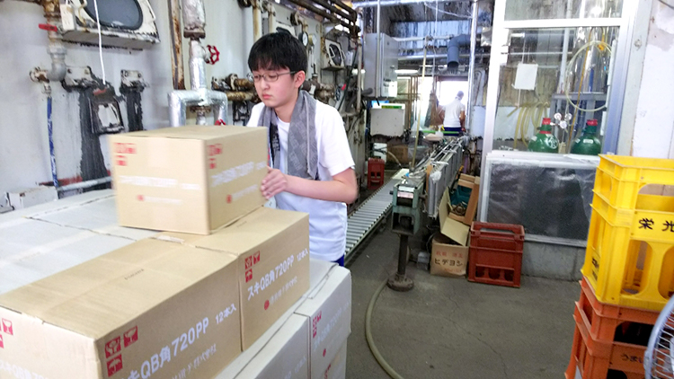 ターンテーブルに流れてきたお酒を箱に入れます。