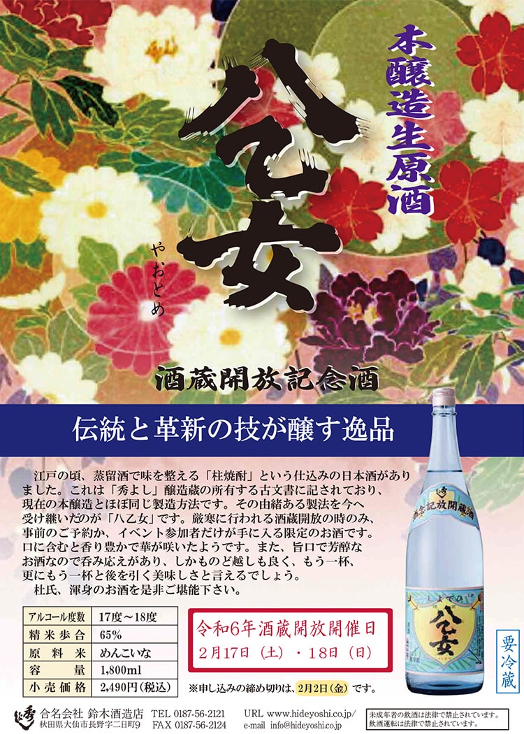 酒蔵開放限定酒として親しまれている「八乙女」。酒蔵開放には遠くて参加できない方や、抽選に外れてしまった方もご予約をいただければ、購入できます。
