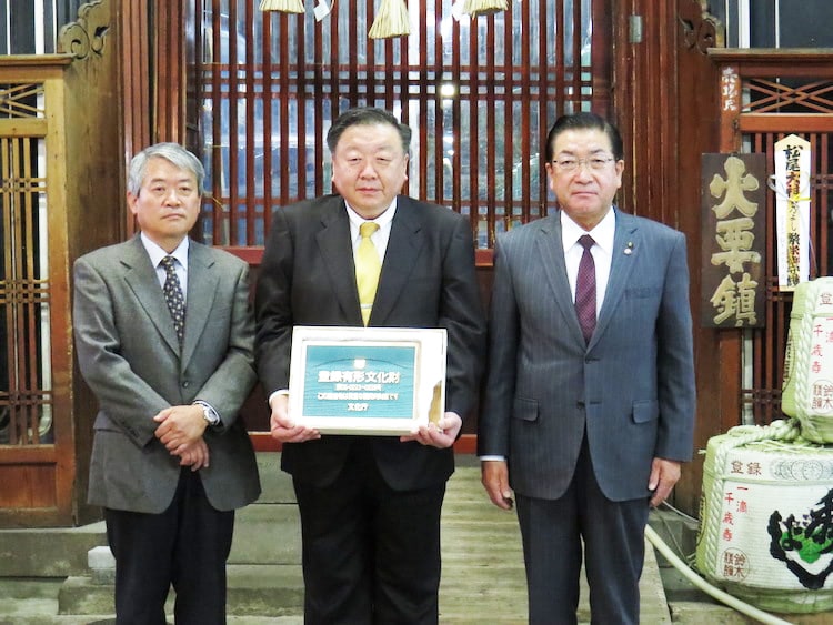 新型コロナウィルスの影響が文化庁へも波及し、証書と銘板がようやく出来上がったそうです。今回は、老松大仙市長が弊社までわざわざ足を運んでいただき、酒蔵の正面で授与式の運びとなりました。誠にありがとうございます。秋田公立美術大学の澤田教授や大仙市文化財保護課の皆様をはじめ、ご協力いただいた多くの方々へ心より御礼申し上げます。