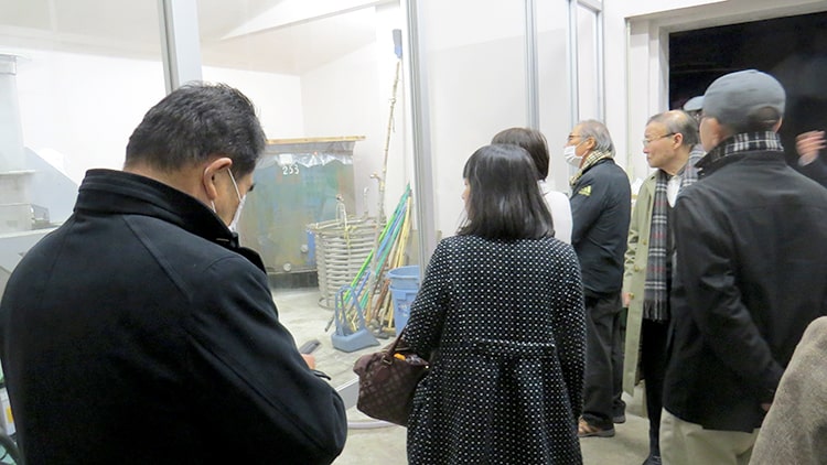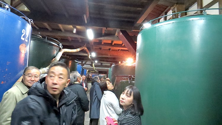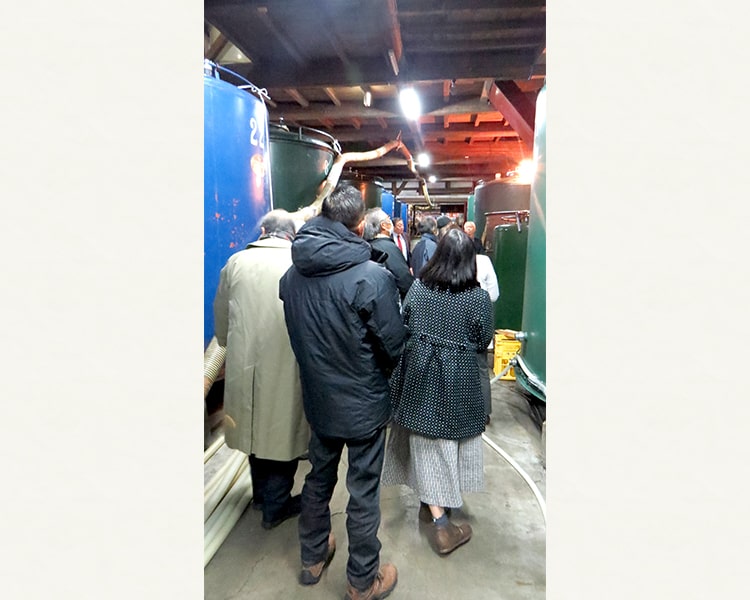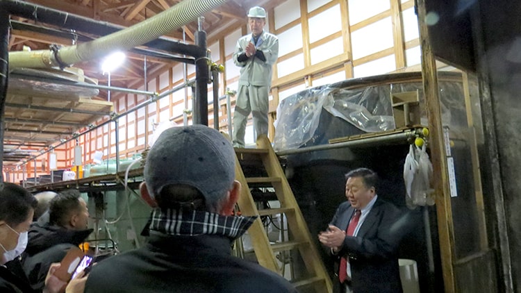 今回は、大曲地区協議会オリジナル清酒「大曲」を仕込む蔵と新しく設備した醸造機械などを見ていかれました。何故だか参加者全員楽しげな雰囲気で、この後の懇親会も控えているからでしょうか。