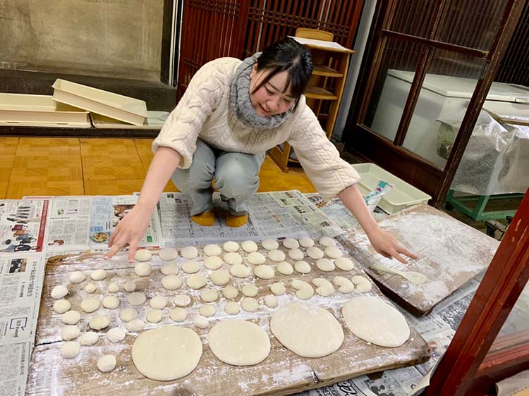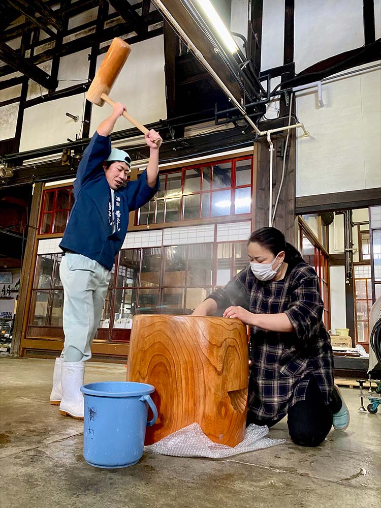 酒蔵の頭が丁寧に餅米を捏ねてから、『ズバーン!バシーン!』と威勢の良い音を立てて搗き始めました。家内の相どりの手捌きも見事にツヤツヤの餅が搗かれていきます。片栗粉が振られた餅台に湯気が立っている餅がドンと置かれ、手早く丸められていきます。