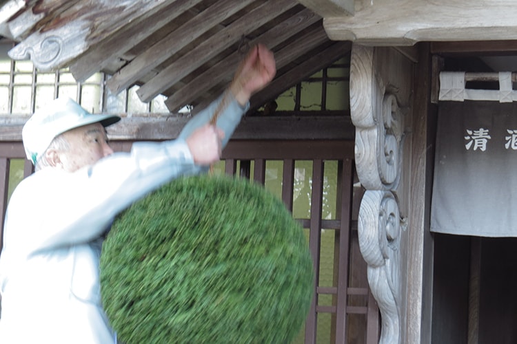 元々、杉の枝自体が造り酒屋の看板でしたが、交差させた杉の枝を紐で結び、美しく丸く刈り上げたのが杉玉です。