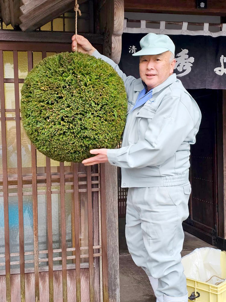 この新酒発売を知らせる酒林は、自分の山にいって杉の葉をとり、試行錯誤の上作り上げました。完全な円球まではいきませんがお酒と同様、楽しんでいただけますと幸いです。