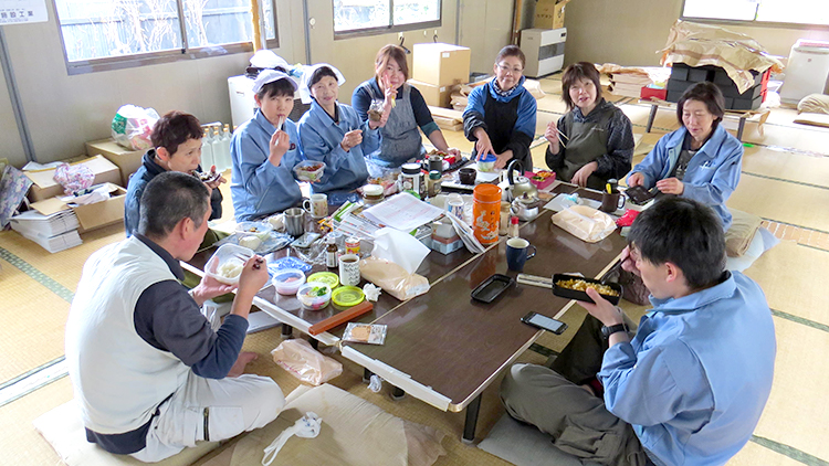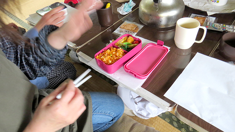 色々持ち寄って和気あいあいと食べます。食べながらの会話の音量はテレビの音が聞こえないくらいの大音量です。