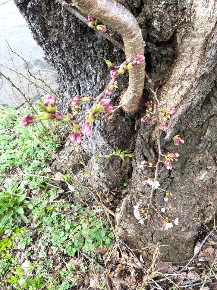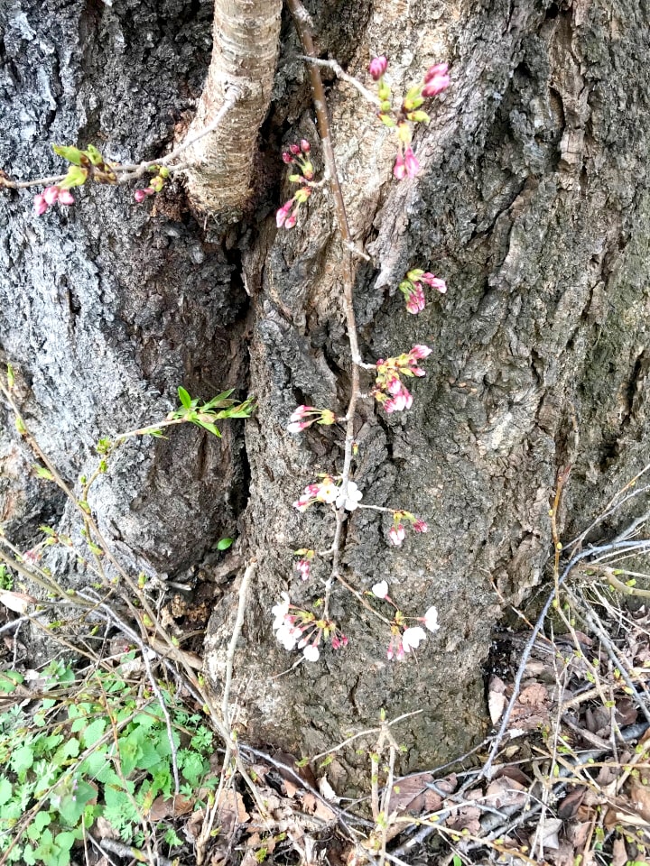 皆さん、写真を見てお分かりになりますか?太い木の幹から若い枝が伸び、桜の花が咲いているのが。しかも本来、伸びるべき方向ではない地面に向かって。