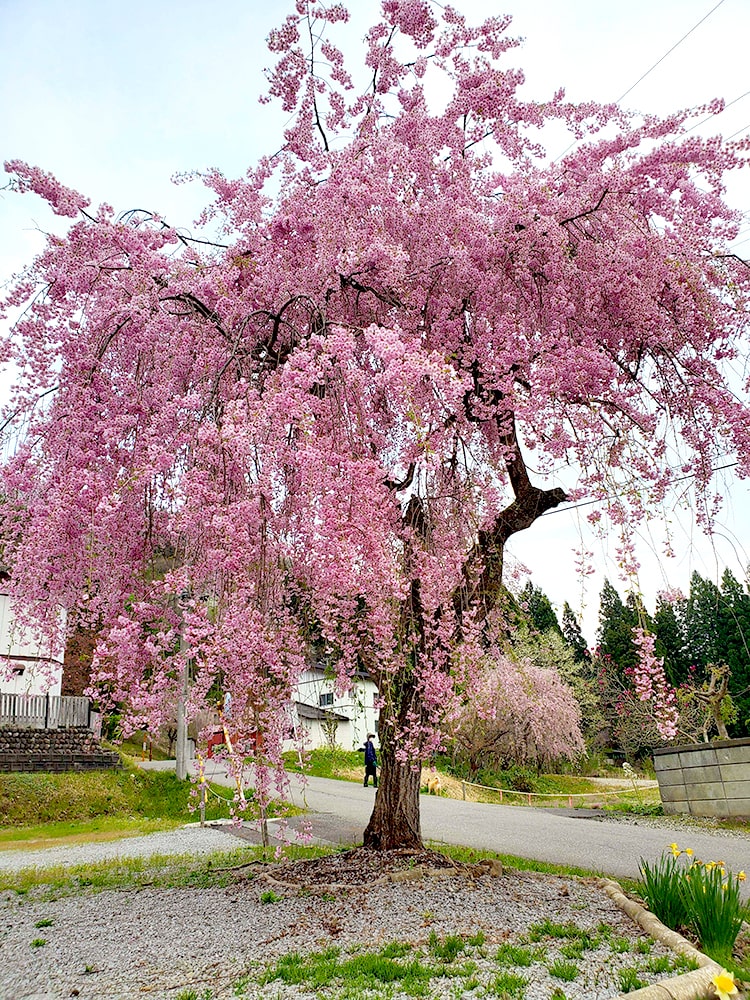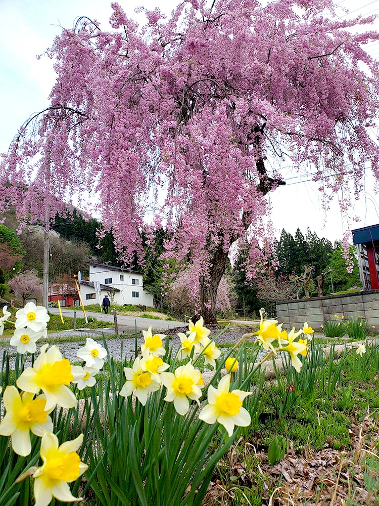 この桜は、私の実家の隣の空き地にある「枝垂れ桜」です。いつも遅めの開花で今が満開です。花の色が少し濃いのが特徴です。