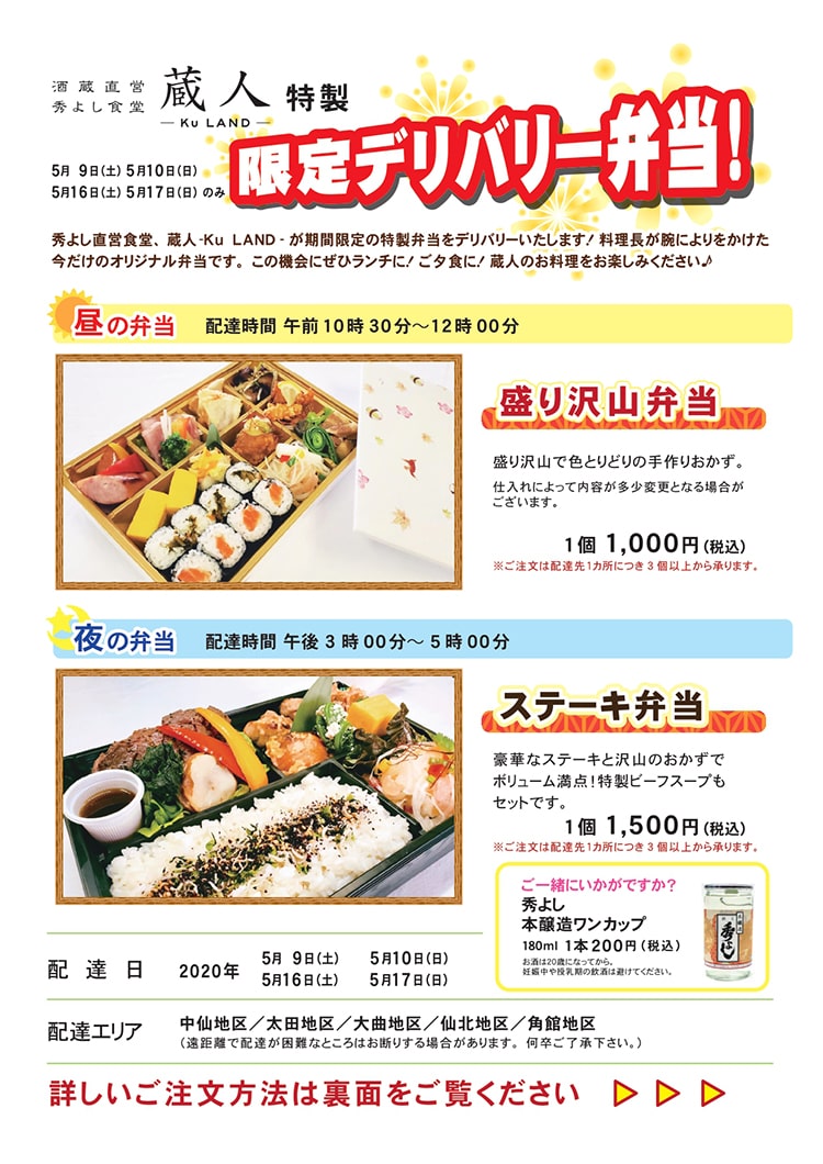 秀よし直営レストラン「 蔵人-Ku Land-」では、期間限定ですがデリバリー弁当をやります。ボリューム満点でお腹がはちきれること間違いなしです!ぜひこの機会にいかがでしょうか?