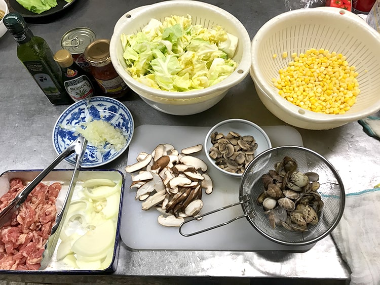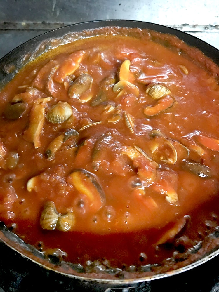 食材の下準備をしてトマトベースのパスタソースが無事完成。味も合格点で、他何品かのお料理と共においしくいただきました!