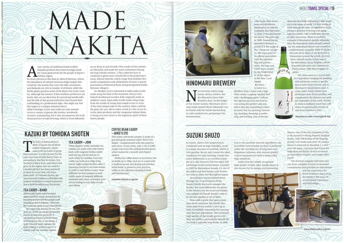 イベント情報やコラム、日本の観光地などについての情報がたくさん載っている中で、秀よしは「MADE IN AKITA」という特集記事として、日の丸醸造様と一緒に掲載されています。