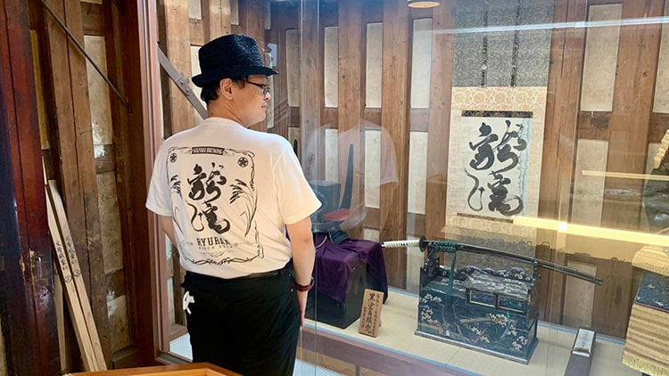 He surprised us by revealing a “Ryuban” T-shirt under his purple-striped shirt! We captured a photo in front of a piece of calligraphy by Emperor Go-Yōzei.